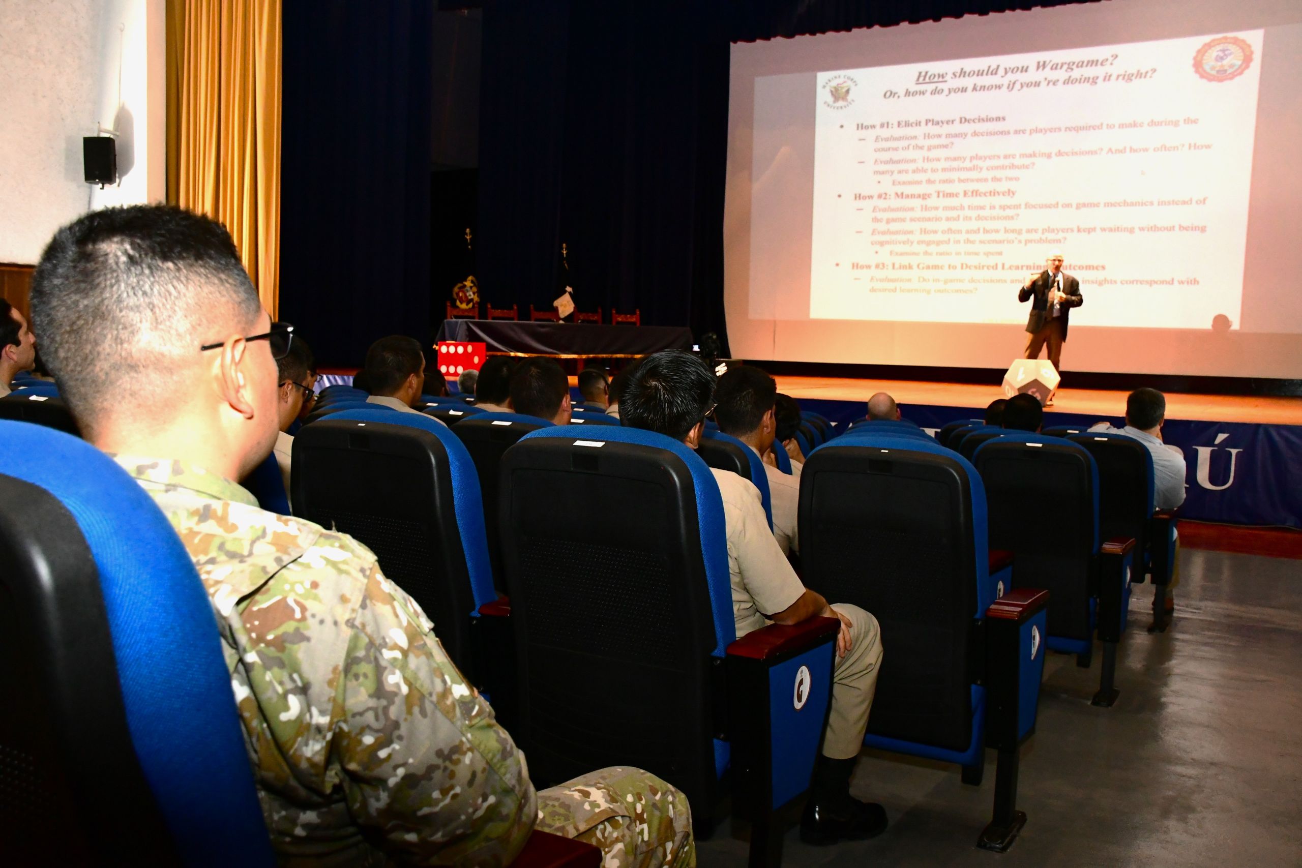 Un destacado aporte académico militar fue el desarrollado durante la conferencia “Operational Wargame System” por el Coronel USMC (r) Timothy Barrick, Director de Juegos de Guerra del Centro Brute Krulak para la Innovación y Guerra Futura de la Marine Corps University, quien es el principal diseñador del Sistema Operacional de Juegos de Guerra del Cuerpo de Marines.
