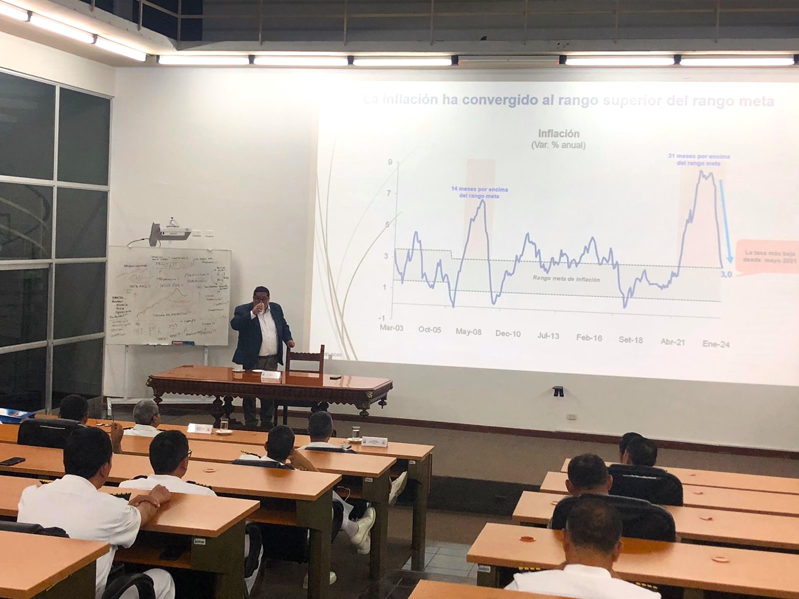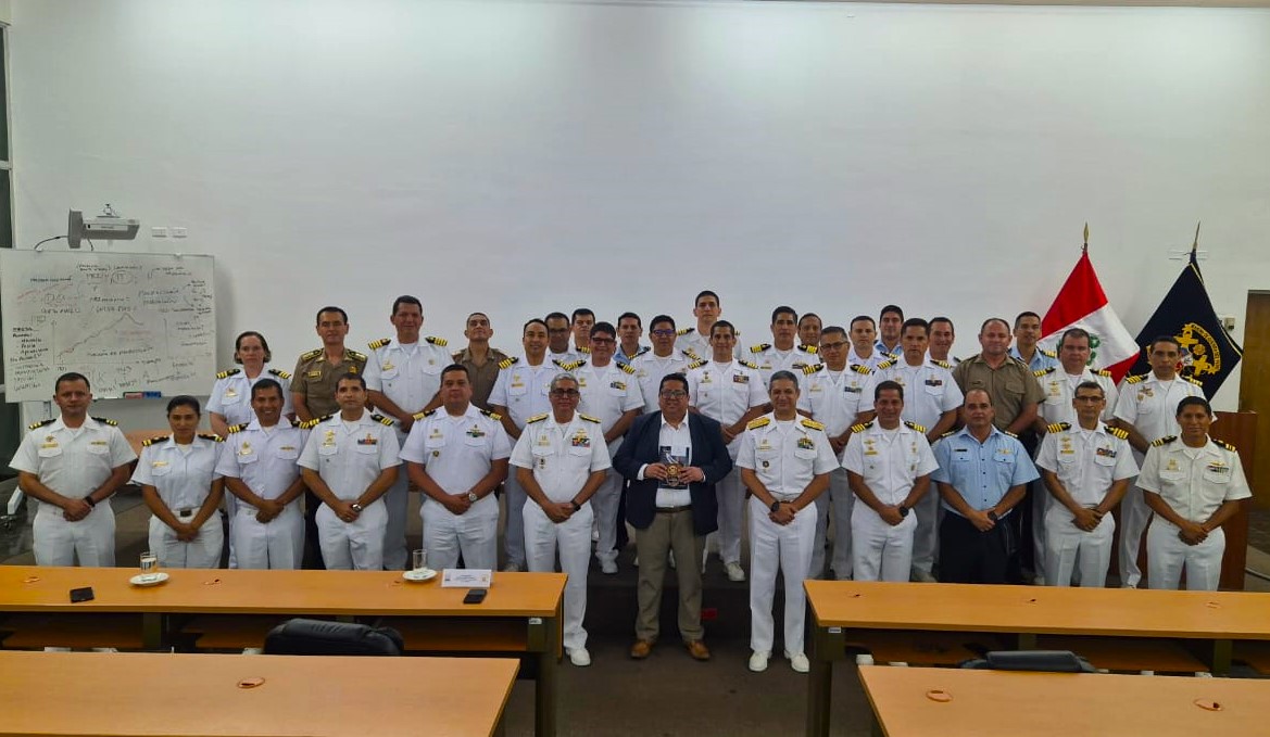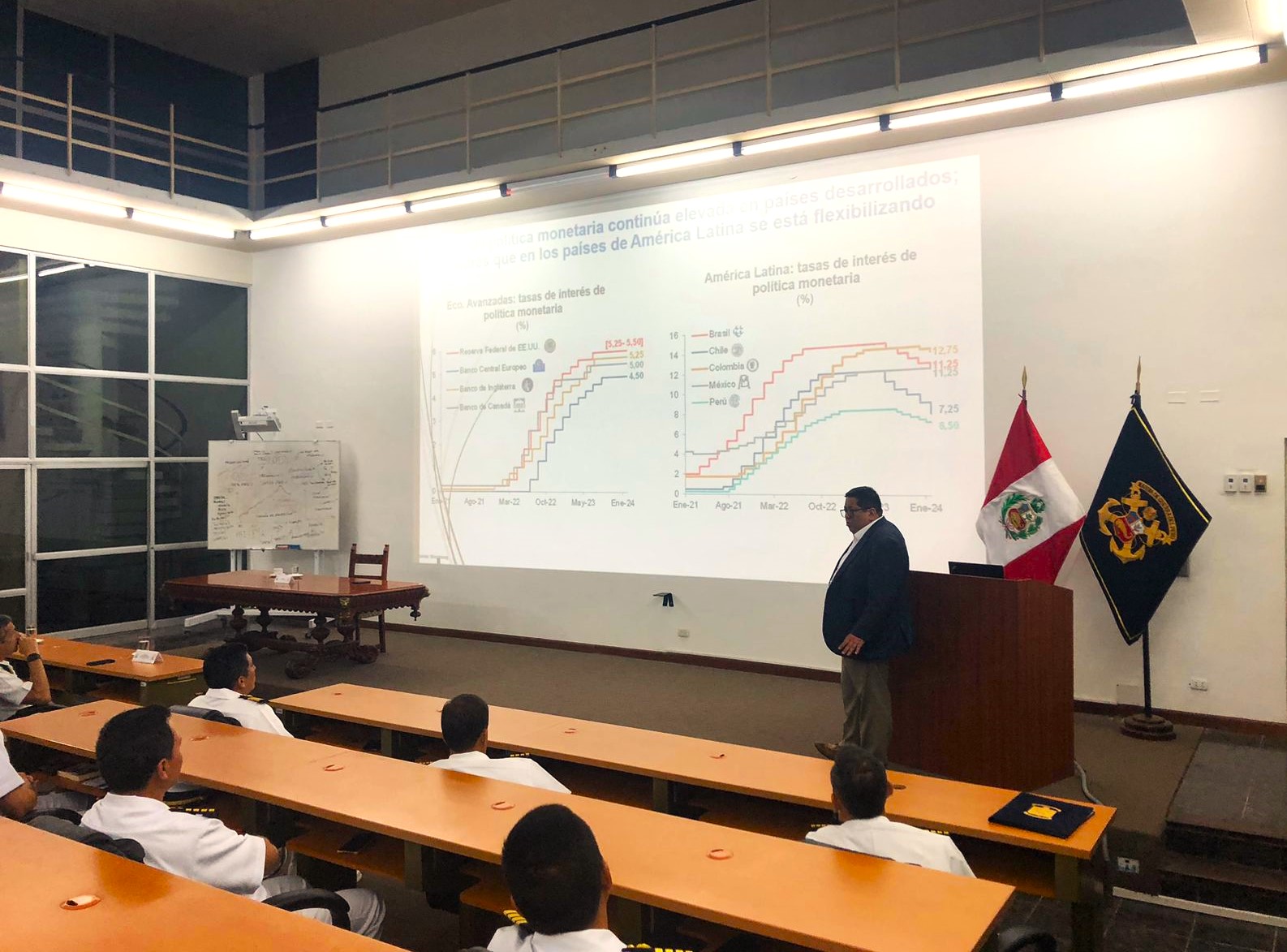 Como parte de la formación de los oficiales estudiantes del Programa del Alto Mando Naval de la Escuela Superior de Guerra Naval, el día jueves 15 de febrero se llevó a cabo la conferencia titulada “Perspectivas Económicas y Retos” por el Magíster Alex Contreras Miranda, ex Ministro de Economía y Finanzas, la cual versó respecto a la situación económica del Perú, la importancia de la inversión en infraestructura y educación, así como del impacto positivo que la industria naval tiene que ofrecer al país.