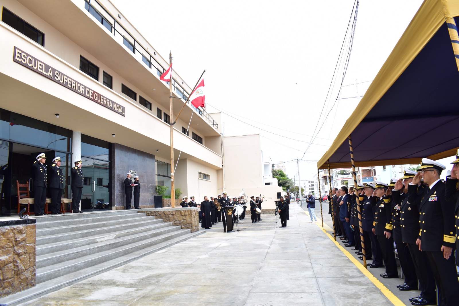 En la fachada de la emblemática Escuela Superior de Guerra Naval, se llevó a cabo la ceremonia conmemorativa por el 95.º aniversario de fundación de esta importante Escuela de Posgrado.