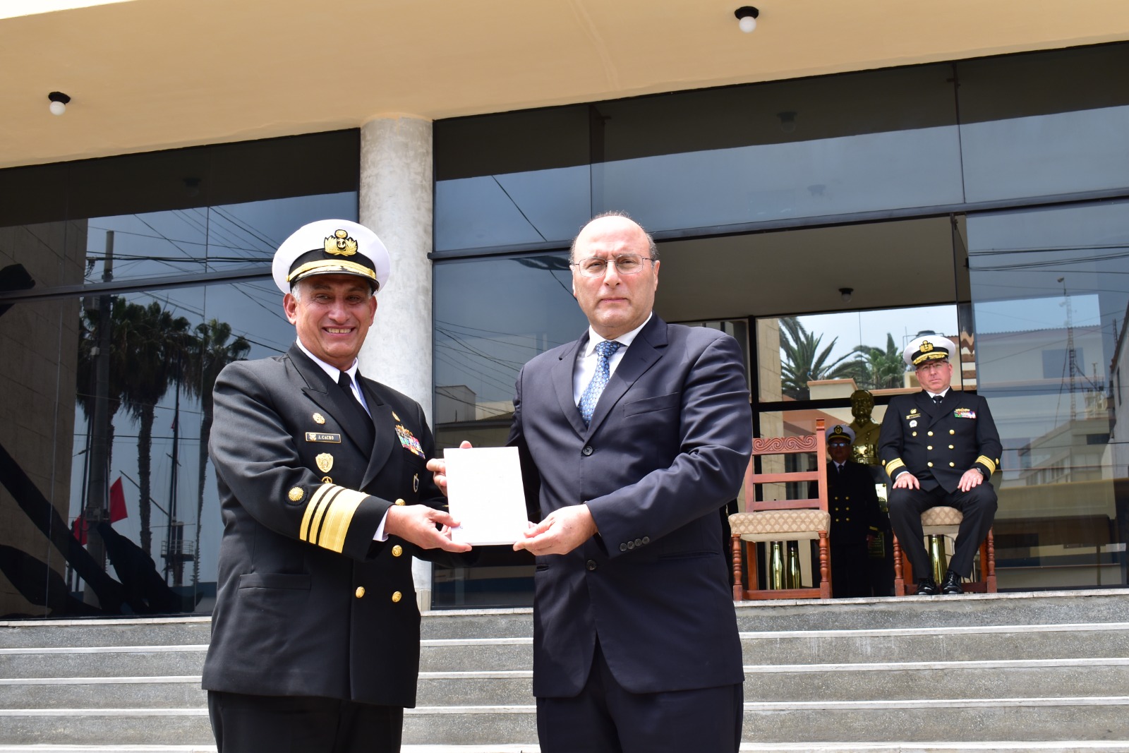 Asimismo, se destacó al Capitán de Navío (r) Eduardo Zarauz Chávez, docente gestor que ha alcanzado el grado académico de Doctor en Sociedad del Conocimiento y Acción en los ámbitos de la Educación, la Comunicación, los Derec nohos y las Tecnologías. Este logro académico no solo refleja su rigor intelectual y compromiso con la investigación, sino que constituye también un valioso aporte al pensamiento estratégico y doctrinario de nuestra Institución.