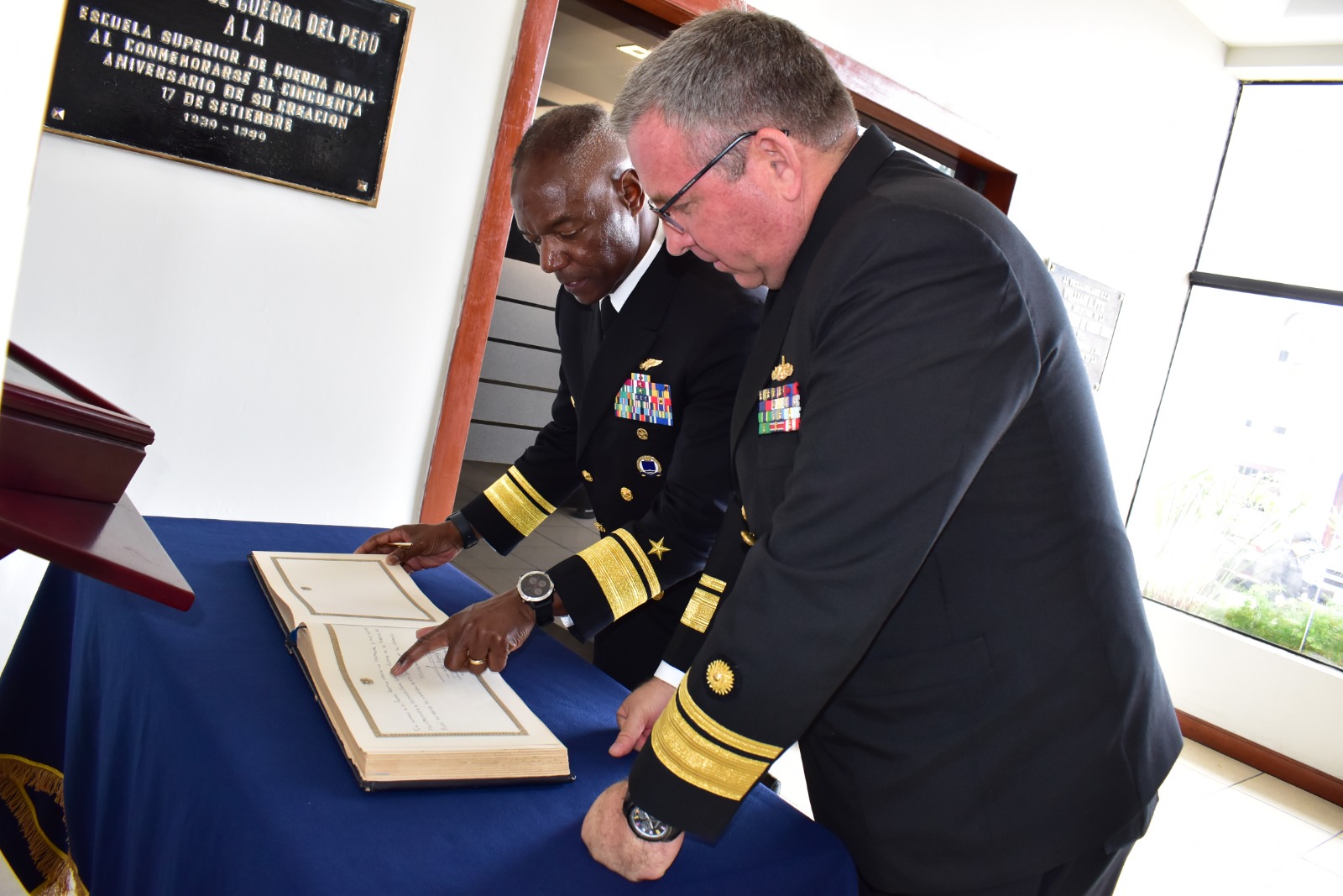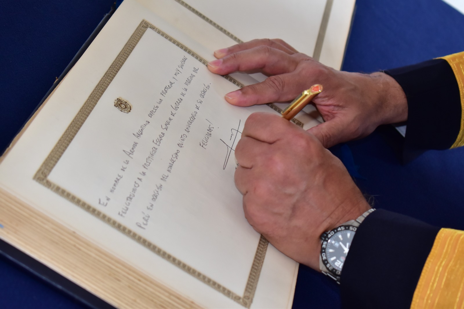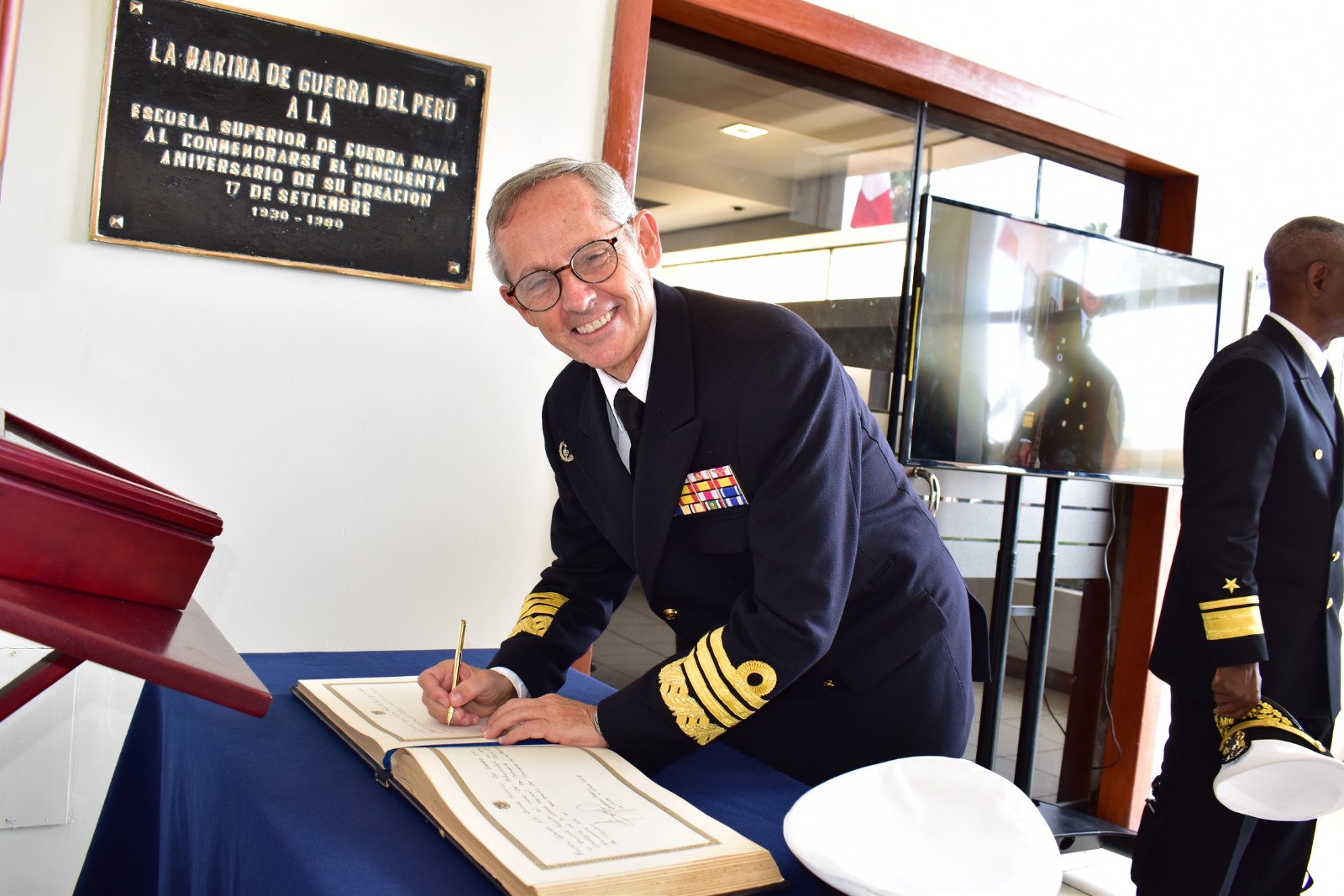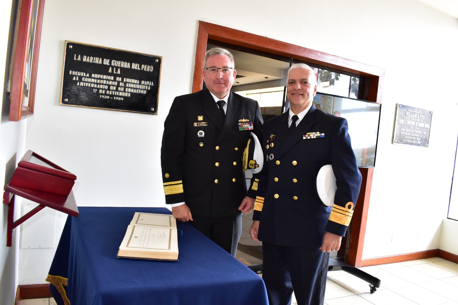 Asimismo, como acto protocolar, las distinguidas personalidades asistentes: el Almirante Gonzalo Sanz, Segundo Jefe del Estado Mayor de la Armada Española; el Vicealmirante ARA Juan Carlos Romay, Director de Educación de la Armada Argentina; y el Contralmirante Darryl Walter, Presidente del U.S. Naval War College, plasmaron su firma y mensaje conmemorativo en el libro de oro de la Escuela Superior de Guerra Naval, como símbolo de respeto y reconocimiento mutuo.