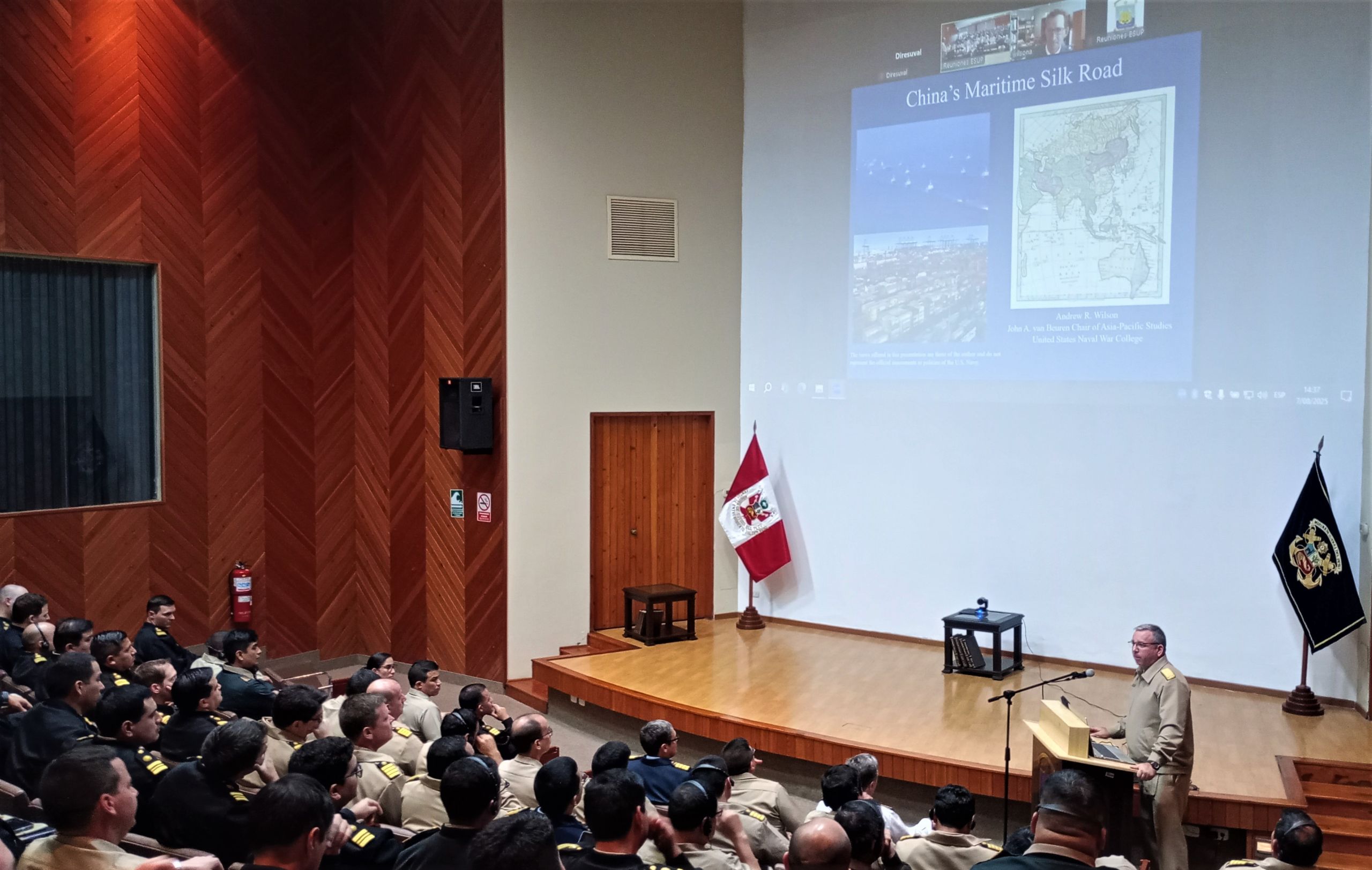 Esta sesión fue transmitida en vivo desde Estados Unidos para los oficiales estudiantes de la Escuela Superior de Guerra Naval gracias a la alianza estratégica con la U.S. Naval War College y, a su vez, reafirma el compromiso institucional con la formación académica y estratégica en temas de seguridad marítima y geopolítica global.